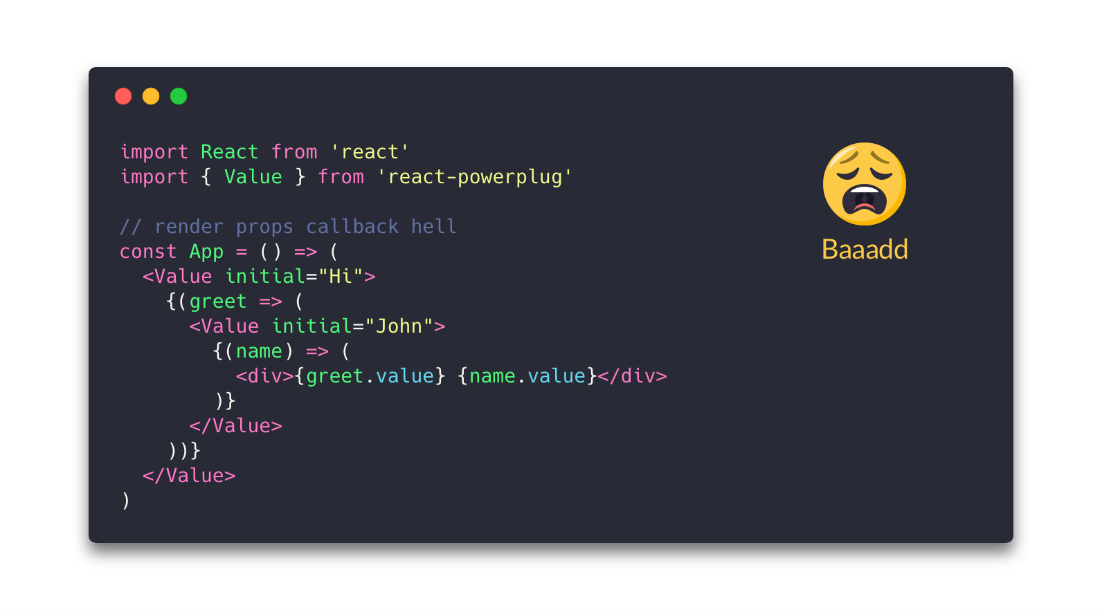 Render Props are the new hype of React's ecosystem, that's a fact. So, when you need to use more than one render props component together, this can be boring and generate something called a "render props callback hell", like this: